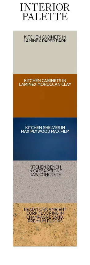 Dowel Jones ‘Half Hurdle’ high chairs in Blaze Blue make a vivid statement against the island front and cabinetry in Moroccan Clay. (Photography: Marnie Hawson / Styling: Belle Hemming)